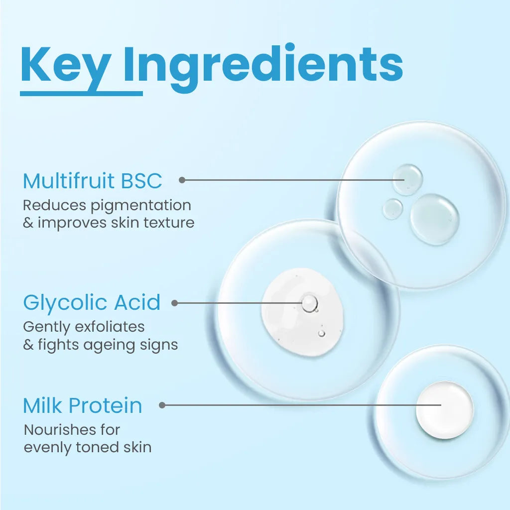 Powered by 10% Glycolic Acid, this exfoliating yet gentle formula effectively removes dead skin cells, unclogs pores, and reveals softer, smoother, and brighter skin. It also contains Multifruit BSC, which enhances cell renewal for a healthier skin barrier. Additionally, Milk Protein plays a vital role in reinforcing the skin’s protective system, ensuring deep nourishment and long-lasting hydration.