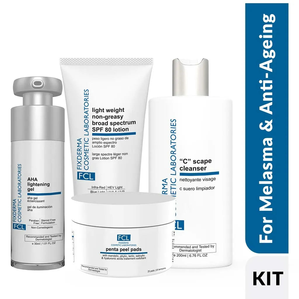 AHA lightening gel + Light weight non-greasy broad spectrum SPF 80 lotion + Penta peel pads + “C” scape cleanser Anti-Melasma Kit is an innovative skin lightening treatment kit which safely reduces the melanin formation giving a radiant glow to the skin. It works on all types of pigmentary disorders related to darkening of the skin.