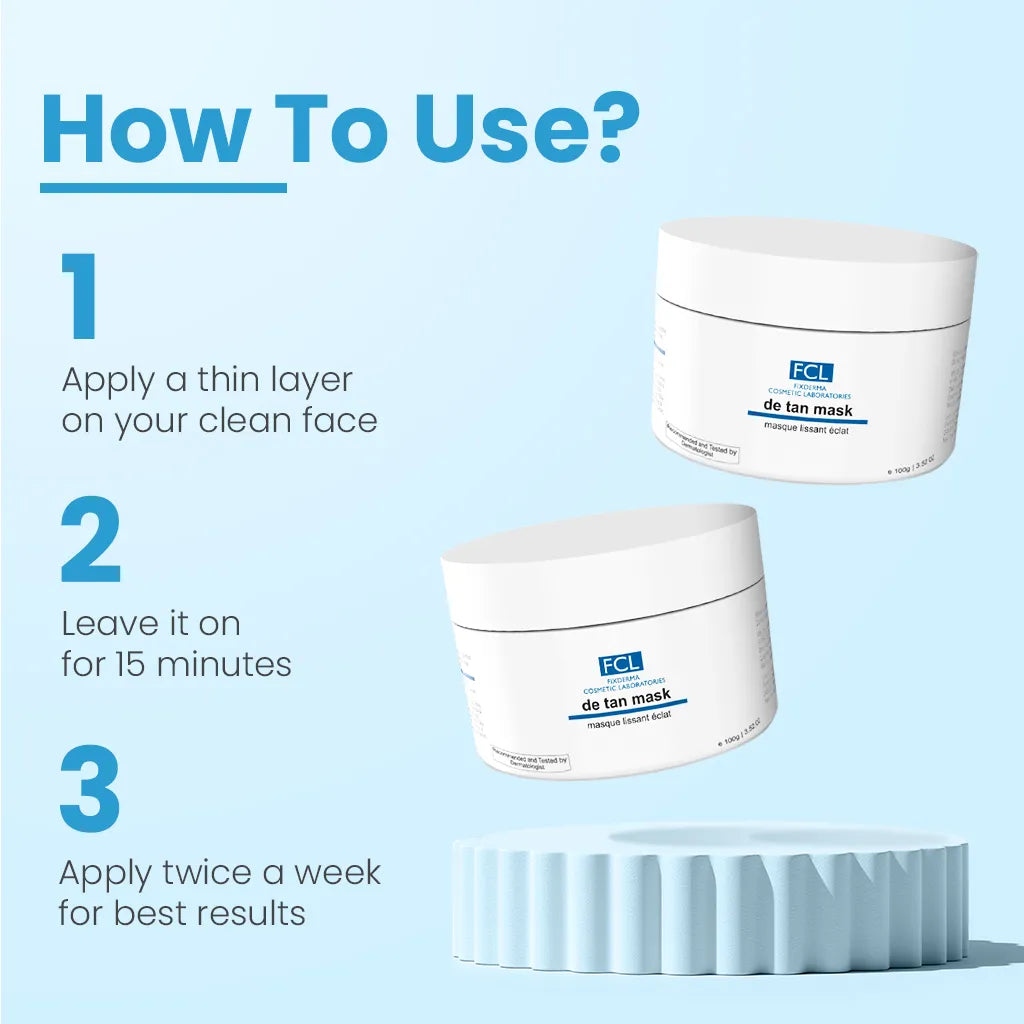 Apply the FCL De-Tan Face Pack and leave it on for 15-20 minutes before rinsing off with lukewarm water for best results.