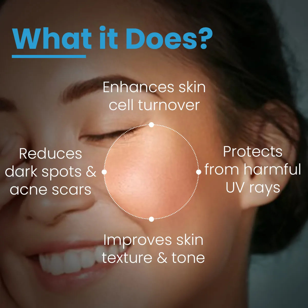 It helps to reduce pigment spots, and melanin production, provides radiance to the skin and exhibits visible results within 1 week.