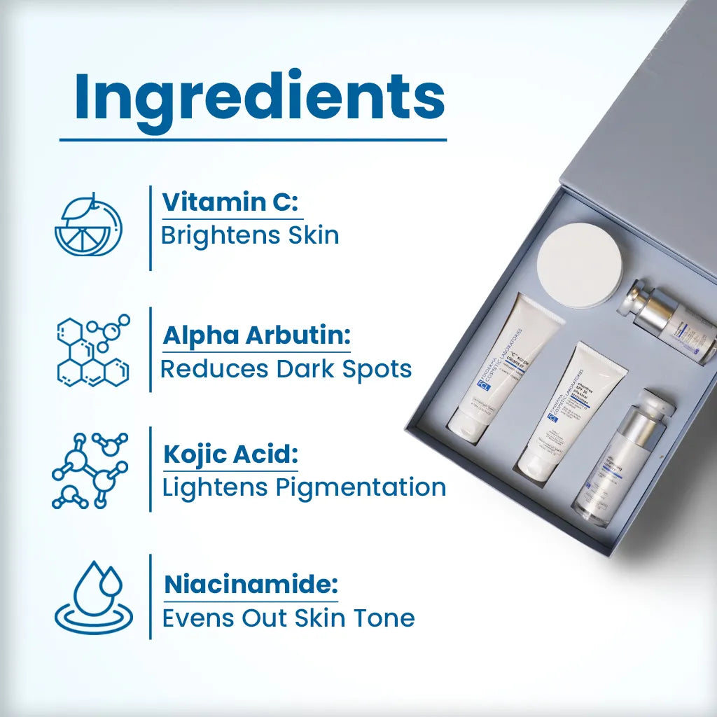 Our Skin Brightening Kit is backed by science, and here's why that matters. Each product in this kit is carefully formulated based on rigorous scientific research and dermatological expertise. From the selection of key ingredients to the specific combinations, our kit is designed to target the biological processes responsible for skin pigmentation and uneven tones. We've harnessed the power of clinically proven elements, ensuring that every product is effective and safe for your skin. This dedication to scientific principles not only guarantees visible results but also provides you with the confidence that your skin is in the hands of a kit that has been meticulously crafted with precision and care. So, when you choose our Skin Brightening Kit, you're choosing a scientifically-backed solution for your skincare needs.