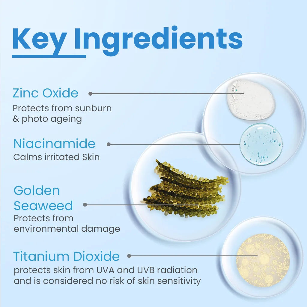 Harness the power of golden seaweed in Chemfree SPF 50 sunscreen. This nutrient-rich ingredient nourishes and protects your skin, providing a natural defense against environmental stressors. It enhances sun protection and also rejuvenates the skin.