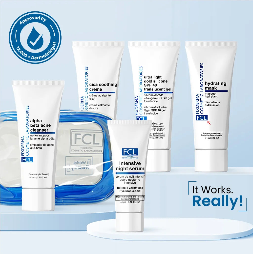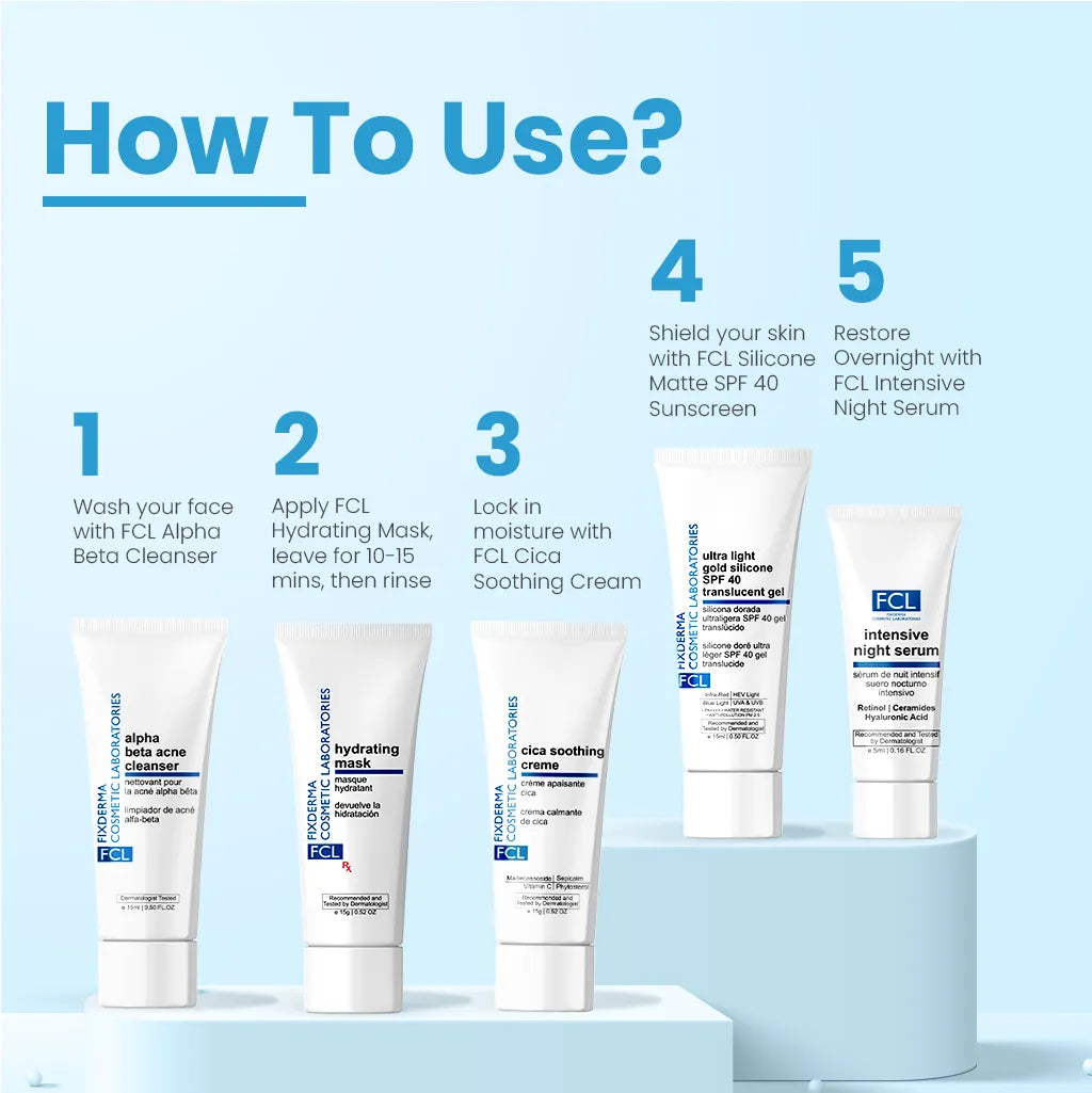 Travel can take a toll on your skin, leading to breakouts, dehydration, and sun damage. The FCL Travel Acne Care Kit is brought together with science-backed formulations to ensure clear, balanced skin wherever you go. The Alpha Beta Cleanser deeply cleanses and unclogs pores. For an instant boost of hydration, FCL Hydrating Mask has 0.5 % Hyaluronic Acid that detoxifies and protects from free radical damage. Followed by the Cica Soothing Cream which calms and nourishes sensitive skin, and the Silicone Matte SPF 40 Sunscreen protects the skin against harmful UV rays. The Intensive Night Serum with retinol that rejuvenates ageing skin overnight. Compact yet effective, this travel kit provides clinically proven care for oily and acne-prone skin anytime, anywhere.