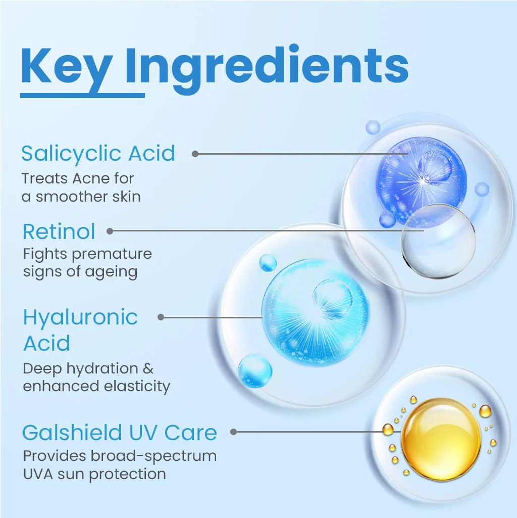 Exfoliates Dead Skin | Targets Acne-causing Bacteria | Non-comedogenic | Soothing Formula For Sensitive Skin | Protects From Harmful Uv Rays | Fights Premature Ageing Signs | Controls Sebum Production | Provides Intense Hydration