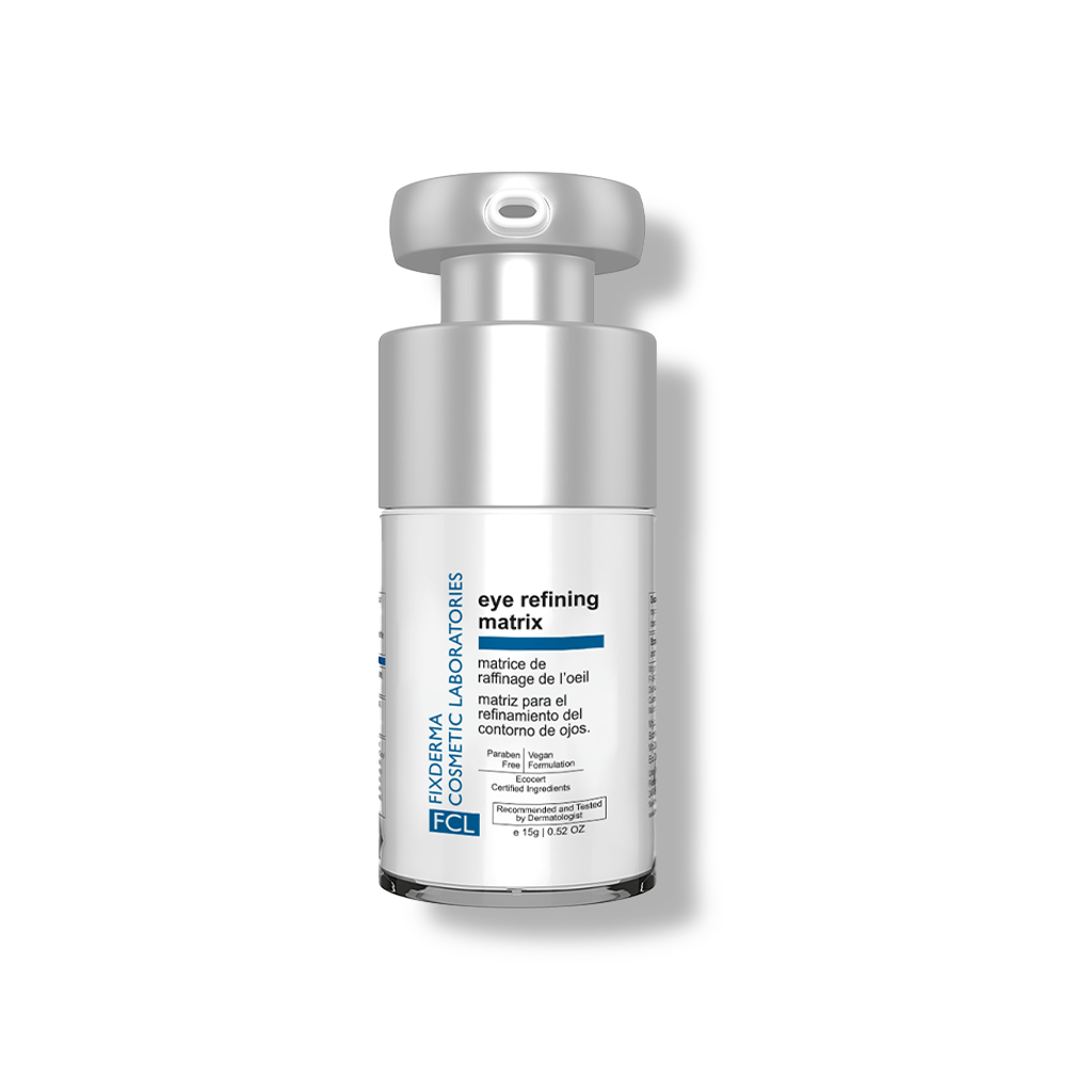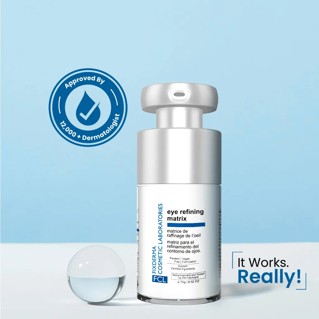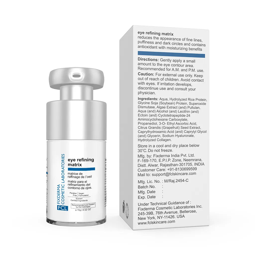 FCL Eye Refining Matrix is an eye serum combined with antioxidants, Vitamin C, and superoxide algae extract with a significant dose of Hyaluronic acid & Hydrolyzed Collagen for moisturizing.